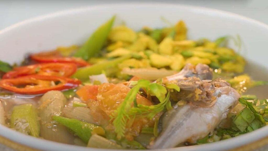 - Canh chua cá chốt ăn cùng cá chiên mắm me và rau sống.