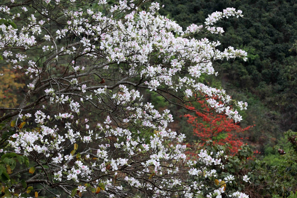 Xen giữa sắc đỏ của hoa gạo là màu trắng tinh khôi của hoa ban, loài hoa đặc trưng của núi rừng Điện Biên.