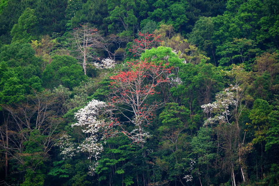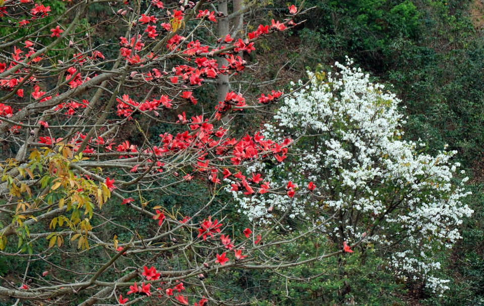 Sắc đỏ của hoa gạo và màu trắng của hoa Bban tạo nên bức tranh thiên nhiên vừa rực rỡ, vừa mềm mại.
